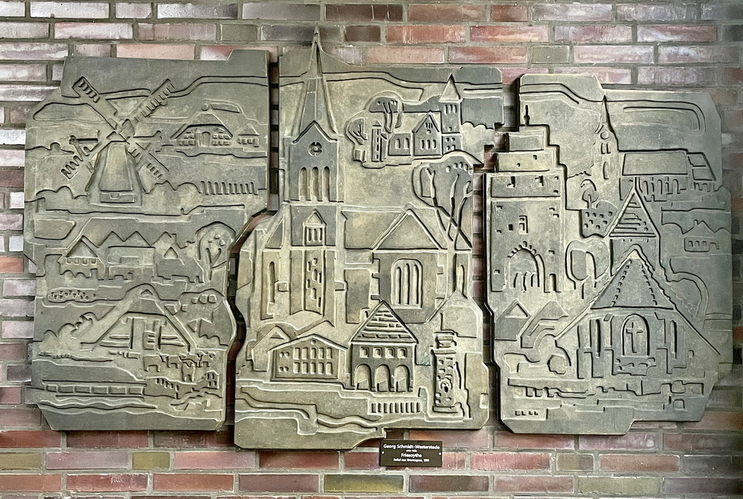 | Metallrelief,1981 Relief aus Bronze-Guss (3-teilig), Friesoythe. Ursprünglich Im Eingangsbereich der Volksbank, ab 2010 im Trauzimmer, später im Treppenhaus des Rathauses Friesoythe. 124 x 202 cm. 26169 Friesoythe, Mühlenstraße 12 + 14